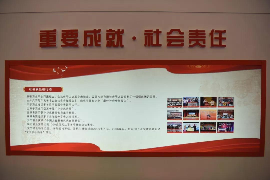 古井貢酒以“中華第一貢”為旗幟,以“做真人,釀美酒,善其身,濟天下”為價值觀,每年發(fā)布《企業(yè)社會責任報告》,踐行國企擔當。金種子酒業(yè)榮獲第十屆“中華慈善獎”,是中國慈善領域的最高政府獎。宣酒集團實施“春蕾、棟梁、敬老、助殘”四大工程,榮獲中華慈善總會突出貢獻獎。文王酒業(yè)在助學扶貧等方面作出突出貢獻,獲授“中國兒童慈善獎突出貢獻獎”。明光酒業(yè)履行社會責任,先后出資1000多萬元從事各項社會公益事業(yè)。