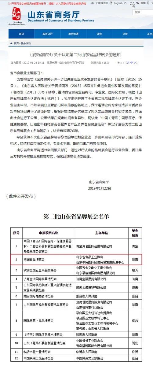 全國食品博覽會榮獲山東省品牌展會的殊榮,不僅是省商務廳對展會走向品牌化權(quán)威肯定,也是對近年來全國食品博覽會在會展產(chǎn)業(yè)